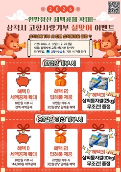 강원 삼척시(시장 박상수)가 2026년 고향사랑기부제 세액공제 혜택 확대를 기념해 설 명절을 맞아 '고향사랑기부제 설맞이 이벤트'를 진행한다. 이번 이벤트는 고향사랑기부제에 참여한 기부자들에게 감사의 마음을 전하고, 기부 문화 확산을 도모하기 위해 마련된 것으