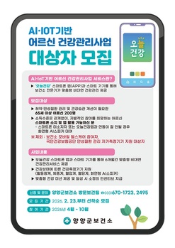 강원 양양군이 스마트기기(AI·IoT) 기반 어르신 건강관리사업에 참여할 65세 이상 어르신 200명을 오는 23일부터 선착순으로 모집한다.스마트기기 기반 어르신 건강관리사업은 허약 예방과 만성질환 관리, 건강습관 개선이 필요한 65세 이상 어르신을 대상으로 '오늘건강