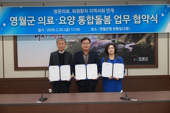 강원 영월군(군수 최명서)이 20일 군청 2층 상황실에서 '영월군 통합돌봄 방문의료·퇴원환자 지역사회 연계 업무협약'을 체결하고, 지역 중심 의료·돌봄 통합지원 체계 구축에 나섰다.협약에는 영월군과 영월의료원, 푸른사랑병원이 참여했다.군은 간호사 및 사회복지사 인건비를