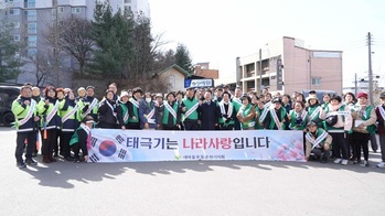 육동한 춘천시장과 새마을운동 춘천시지회, 소양동 한신휴플러스 아파트 입주민들이 23일 한신휴플러스 아파트에서 태극기 달기 홍보 캠페인과 '태극기 달기 시범아파트' 현판식을 진행했다. 이날 행사에서는 태극기 배부와 함께 3·1절 태극기 달기 실천을 다짐하는 발대식이 열렸