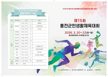 제15회 홍천군민생활체육대회가 오는 20일부터 22일까지 3일간 홍천종합체육관 등 종목별 경기장에서 개최된다. 개회식은 20일 오후 6시 30분 홍천종합체육관에서 열린다. 홍천군체육회가 주최하고 홍천군 회원종목단체가 주관하는 이번 대회는 생활체육 저변을 넓히고