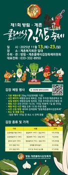 방림·계촌클래식축제위원회가 주최하는 '제1회 방림·계촌클래식김장축제'가 오는 13일부터 23일까지 11일간, 평창군 방림면 계촌복지회관 일원에서 열린다.이번 축제는 '음악이 흐르는 마을'로 알려진 계촌의 감동에 전통 김장 문화의 즐거움을 더한 특별한 농촌형 체험 축제로