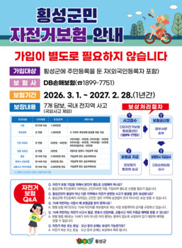 강원 횡성군(군수 김명기)이 군민들이 안심하고 자전거를 이용할 수 있는 환경을 조성하기 위해 '2026년도 자전거 사고 보험' 재가입을 완료했다.이번 보험의 보장 기간은 올해 3월 1일부터 내년 2월 28일까지 1년이며, 횡성군에 주민등록을 둔 군민이라면 별도의 신청