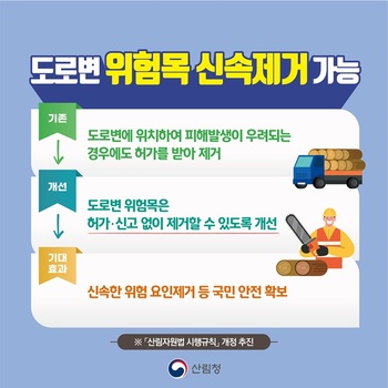 북부지방산림청(청장 이상익)이 국민 안전 확보를 위해 도로변 위험목을 허가나 신고 없이 즉시 처리할 수 있도록 개선하고, 산불 예방 목적의 민가 주변 수목 벌채를 허용하는 규제개선을 추진 중이라고 25일 밝혔다.현재는 도로변 산림 내 위험목이 자동차나 보행자에게 피해를