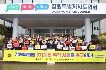 강원특별자치도의회(의장 김시성)가 25일 도의회 본관 앞에서 '강원특별법 3차 개정안'의 조속한 국회 심사를 촉구하는 결의대회를 열었다. 이번 결의대회는 개정안이 발의된 이후 국회에서 심사조차 제대로 이뤄지지 않고 있는 상황에 대한 도민들의 인내 한계와 지역 균형발전에