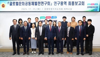 강원특별자치도의회 '글로벌문화공동체발전연구회(회장 박호균 의원, 간사 강정호 의원)'가 25일 도의회 세미나실에서 '강원특별자치도 이민정책 추진 방향' 연구용역 최종보고회를 개최했다.이번 보고회는 외국인 유학생 정착을 중심으로 한 강원형 이민정책의 정책 로드맵을 제시하