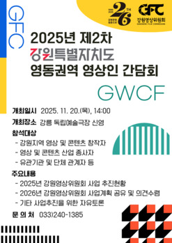 강원문화재단(대표이사 신현상)이 20일 강릉 독립예술극장 신영에서 '2025년도 제2차 강원특별자치도 영동권역 영상인 간담회'를 개최한다.이번 간담회는 2025년도 강원영상위원회 사업 추진 현황을 공유하고, 지역 영상 및 콘텐츠 산업 관계자와의 대화를 통해 내년도 사업