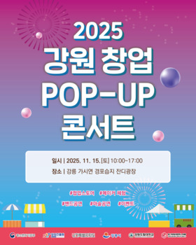 강원도립대학교(총장 최종균)가 오는 15일, 강릉 경포 가시연 습지 잔디광장에서 도내 창업자와 지역주민이 함께 참여하는 '2025 강원 창업 POP-UP 콘서트'를 개최한다. 이번 행사는 창업, 체험, 문화가 어우러진 상생형 로컬 혁신 축제로 기획돼 지역 창업