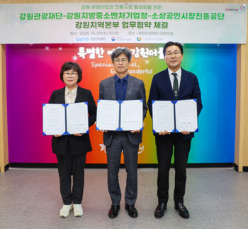 강원관광재단(대표이사 최성현)과 강원지방중소벤처기업청(청장 박순홍), 소상공인시장진흥공단 강원지부(본부장 백순임)가 지난 29일 강원 관광산업과 전통시장 연계 활성화를 위한 업무협약을 체결했다.이번 업무협약은 '2025-2026 강원 방문의 해'를 계기로 관광프로그램과