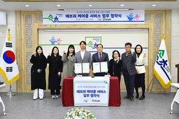 강원 속초시(시장 이병선)가 28일 시청 상황실에서 AI 기반 양방향 대화형 돌봄서비스 '에브리 케어콜(Evry Carecall)' 도입을 위한 업무 협약식을 개최했다.이날 협약식에는 이병선 속초시장을 비롯한 담당 관계자, ㈜에브리에이아이코리아 김태응 대표이