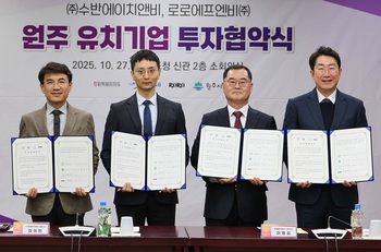 강원특별자치도(도지사 김진태)가 27일 강원특별자치도청에서 원주시, ㈜수반에이치앤비, 로로에프엔비㈜ 2개 기업과 총 396억 원 규모의 투자협약을 체결했다. 이번 협약으로 두 기업은 총 347명의 신규 일자리를 창출할 계획이다.㈜수반에이치앤비는 262억 원을 투자해 1