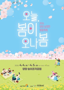양양 남대천이 4월부터 화려한 벚꽃과 감성 가득한 축제의 장으로 변신한다.양양군과 양양문화재단은 내달 4일부터 5일까지 이틀간 남대천 송이조각공원 및 인접 도로 일원에서 '2026 양양 남대천 벚꽃축제'를 개최한다. 재단은 벚꽃 가로수 구역에 '벚꽃