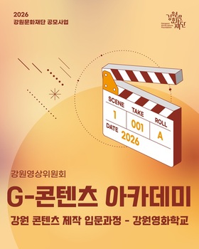 강원문화재단(대표이사 신현상)이 도내 영상·콘텐츠 전문인력 양성을 위한 G-콘텐츠 아카데미 '강원 콘텐츠 제작 입문과정–강원영화학교'의 운영단체를 공개 모집한다.지원대상은 영화제작 및 영상문화 관련 교육 프로그램에 대한 운영 역량을 갖춘 도내 영화·영상관련 단체로 심의