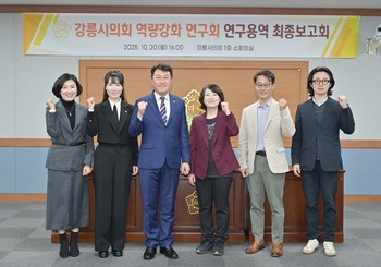 강릉시의회 의원연구회인 '강릉시의회 역량강화 연구회'가 20일 오후 4시, 시의회 1층 소회의실에서 '강릉시의회 자율성 및 독립성 확보 방안'을 주제로 연구용역 최종보고회를 개최했다.이날 보고회에는 서정무 대표의원을 비롯한 신보금, 윤희주 의원이 참석했으며, 권자경 교