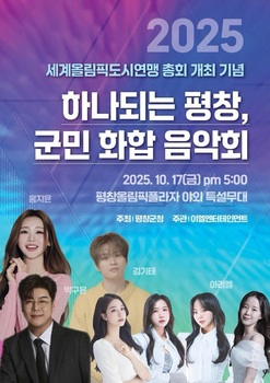 강원 평창군(군수 심재국)이 2025 세계올림픽도시연맹 총회 개최를 기념해 오는 17일 오후 5시, 평창올림픽플라자 잔디광장에서 '하나 되는 평창, 군민 화합 음악회'를 개최한다.이번 음악회는 지난 2018 평창동계올림픽의 감동을 다시금 되새기고, 군민이 함께 어울리며