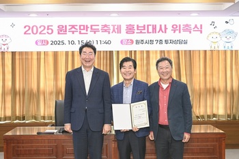 강원 원주시(시장 원강수)가 오는 24일부터 26일까지 3일간 열리는 '2025 원주만두축제'의 성공적 개최를 위해, 15일 이연복 셰프 홍보대사 위촉식을 개최했다.원주시청 7층 투자상담실에서 진행된 홍보대사 위촉식에는 원강수 시장, 박창호 원주문화재단 대표이사, 이연