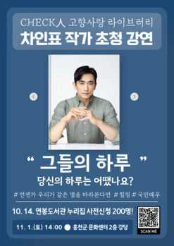 홍천군립도서관이 내달 1일 오후 2시 홍천군 문화센터 2층 강당에서 차인표 작가를 초청해 체크인 고향사랑 라이브러리 마지막 강연을 개최한다. 이번 강연의 주제는 '그들의 하루, 당신의 하루는 어땠나요?'로, 감미로운 피아노 연주와 함께 평범한 하루 속에서도 누