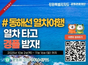 강원특별자치도(도지사 김진태)와 강원관광재단(대표이사 최성현)이 2일부터 내달 16일까지 'KTX 동해선 철도여행 인증 이벤트'를 운영한다.추석 연휴와 가을철 성수기에 맞춰 동해선 철도여행 활성화를 위해 마련된 이번 이벤트는 강릉, 동해, 삼척, 부산 부전역 등 동해선