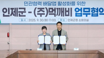 강원 인제군(군수 최상기)이 30일 군청 소회의실에서 민관협력 배달앱 '먹깨비' 운영사와 업무 협약을 체결하고, 지역 소상공인 경영 안정과 군민 편익 증진을 위한 본격적인 협력에 나섰다.이번 협약은 평균 7.8%에 달하는 민간배달앱 주문 수수료와 높은 배달비로 어려움을
