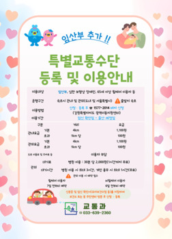 강원 속초시(시장 이병선)가 교통약자의 이동 편의를 높이고 교통복지를 강화하기 위해 특별교통수단 이용 대상에 임산부를 포함하도록 조례를 개정하고, 오는 23일부터 시행한다.특별교통수단은 대중교통 이용이 어려운 교통약자의 이동권 보장을 위해 운영되는 차량이다. 현재 속초