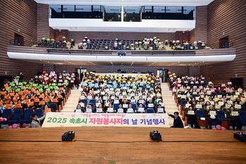 속초시자원봉사센터(센터장 하종수)가 17일 속초문화예술회관에서 500여명의 자원봉사자가 참석한 가운데 '2025년 속초시자원봉사자의 날' 기념행사를 성황리에 개최했다.이번 행사는 한 해 동안 온기 나눔과 지역사회 발전을 위해 헌신해 온 자원봉사자들의 노고에 감사의 의미