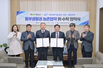 강원 횡성군(군수 김명기)이 17일 한국농어촌공사 홍천·춘천지사와 '동부생활권 농촌협약'에 대한 업무 위·수탁 협약을 체결했다.이날 협약식은 횡성군청 군수실에서 김명기 횡성군수와 황희동 한국농어촌공사 홍천·춘천지사장을 비롯한 양 기관 관계자들이 참석한 가운데 진행됐다.