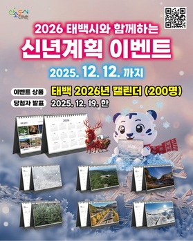 강원 태백시(시장 이상호)가 12일까지 시민과 관광객을 대상으로 '2026년 신년계획 SNS 구독 이벤트'를 진행한다. 참가자 중 추첨을 통해 태백시 사계절을 담은 2026년 달력을 제공한다.이번 이벤트는 주요 시정 소식과 지역 명소를 보다 쉽고 친근하게 전달하기 위한