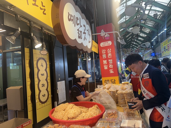 먼저 오전 11시에는 강릉 중앙시장에서 손창환 글로벌본부장을 비롯한 직원 100여 명이 참여해 제수용품과 지역 농·특산물을 구입하고, 각자내기 오찬을 함께하며 소비 촉진과 지역경제 활력 제고에 기여했다.