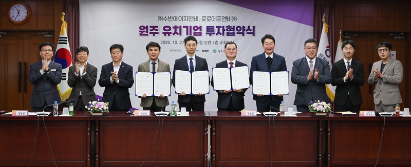 강원특별자치도(도지사 김진태)가 27일 강원특별자치도청에서 원주시, ㈜수반에이치앤비, 로로에프엔비㈜ 2개 기업과 총 396억 원 규모의 투자협약을 체결했다. 이번 협약으로 두 기업은 총 347명의 신규 일자리를 창출할 계획이다.