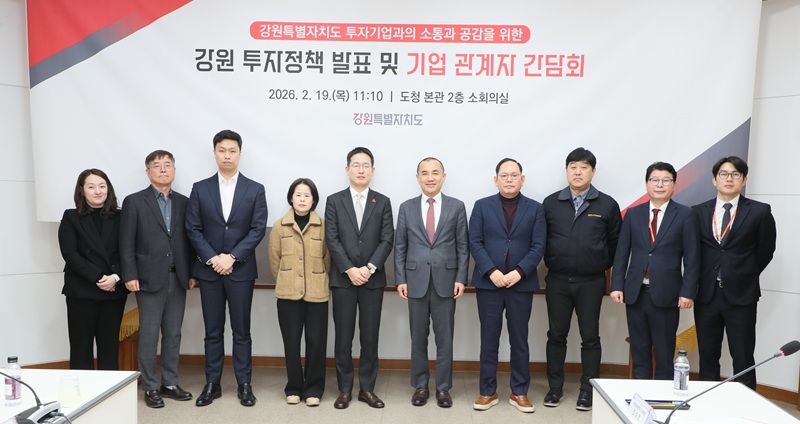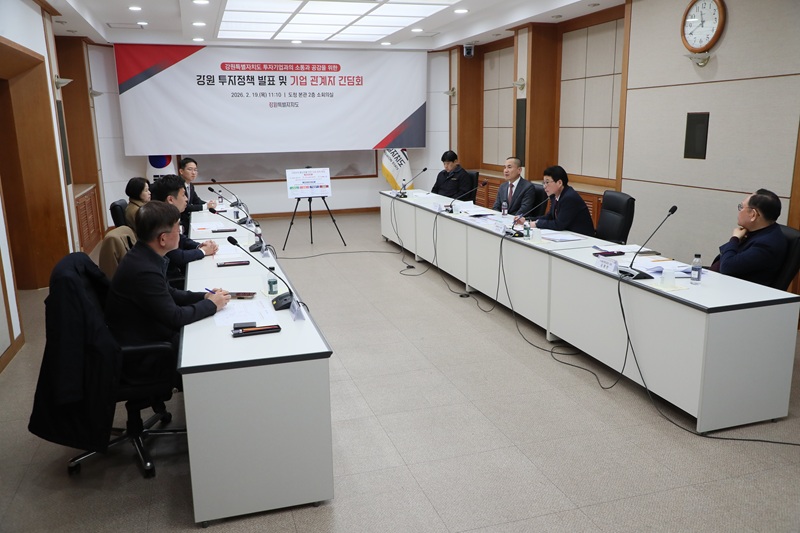 강원특별자치도(도지사 김진태)가 민선 8기 출범 이후 56개 기업, 1조8644억 원 투자, 2938명 신규고용을 달성했다고 밝혔다. 도는 이 같은 성과를 바탕으로 19일 '2026년도 강원 투자정책'을 발표하고 도내 투자기업 대표 및 관계자들과 간담회를 가졌다. 이 자리에는 ㈜알몬티대한중석, ㈜한국정밀소재산업, (주)에이엔티파마, ㈜미코세라믹스, ㈜광덕에이엔티, ㈜넥스트바이오 등 도내 이전 또는 공장 신설을 추진 중인 기업들이 참석해 투자 현황과 애로사항을 공유했다.